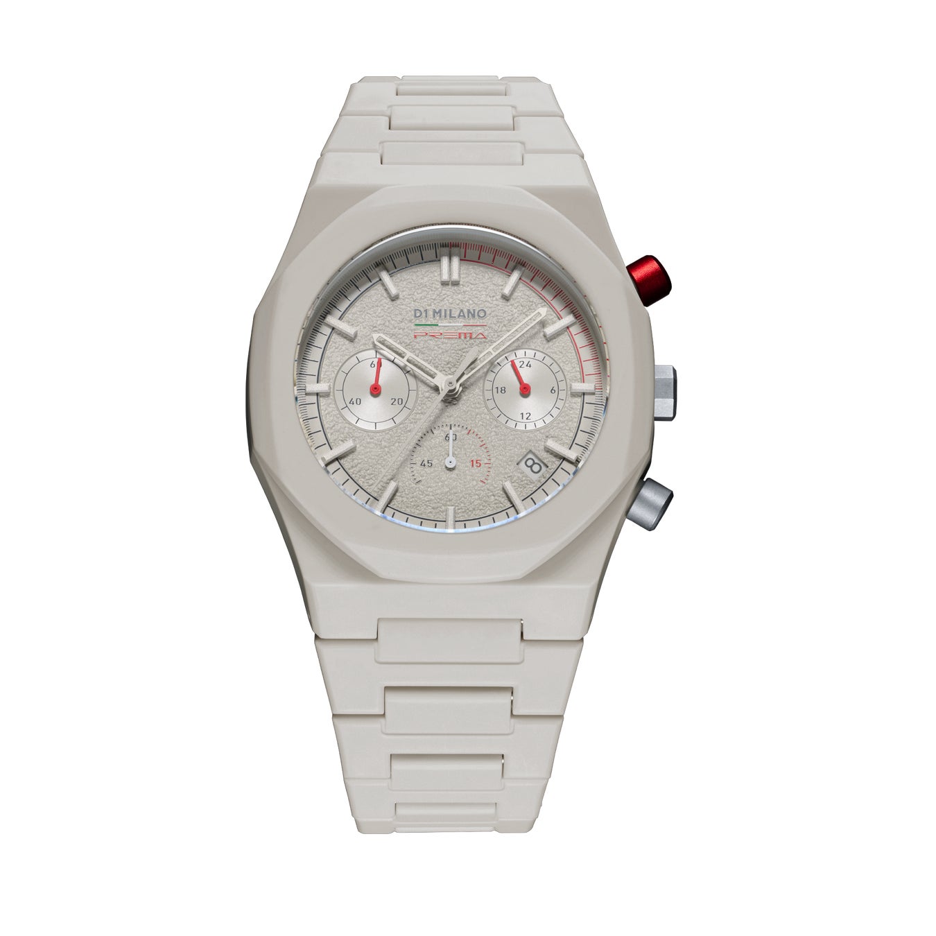 このコラボレーションのベースとなるのは、D1 Milanoの人気シリーズ「ポリカーボン」から誕生した特別仕様のクロノグラフ「ポリクロノ」。文字盤には、レーシングサーキットの荒々しい路面をイメージしたアスファルトグレインのテクスチャが施され、独自の深みと視覚的なインパクトを与えます。ユニークなトープカラーに鮮烈な赤いプッシャーボタンがアクセントとなり、レーシングスピリットを際立たせます。ケースとバンドには、軽量で耐久性に優れたポリカーボネートを使用し、ソフトタッチコーティングが滑らかで心地よい装着感を提供します。高級感と快適さを兼ね備えた、まさに理想的な相棒です。