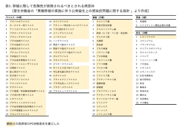 【本件のポイント】 ● 異種移植用ドナー豚の感染症リスクを評価する病原体検査パネルを国内で初めて開発 ● 本パネルによって検査できる病原体数は現時点で世界最多、先行国を大きく上回る ● 国内で開発中の異種移植ドナー候補となるブタの清浄性を検査することにも成功 |
