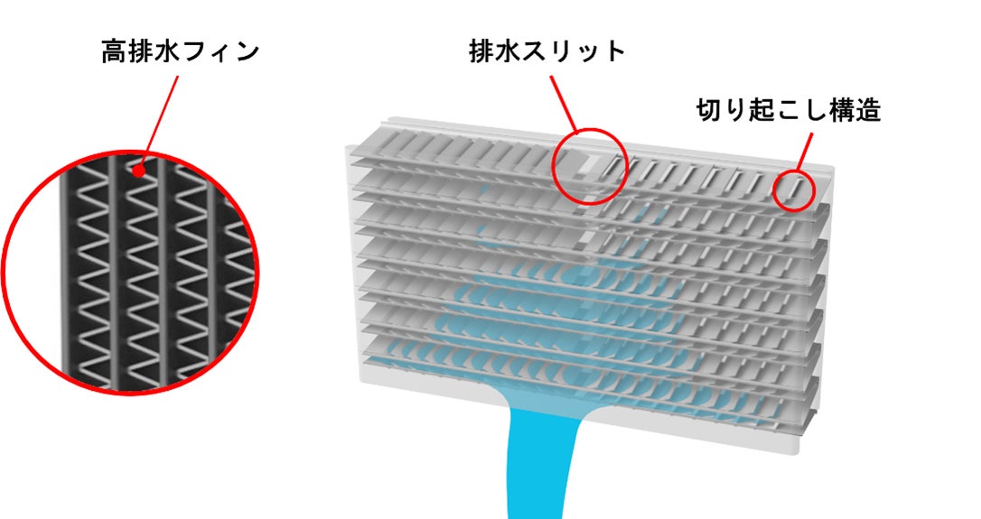 この他、独自の解析技術を用いて排水性を大幅に向上させた新構造のフィンも採用することで、暖房中の除霜運転時に霜が溶けた水が熱交換器から排出されずにフィン上で凍結し、熱交換器の通気を妨げて空調機能が低下するという課題を解決しました。