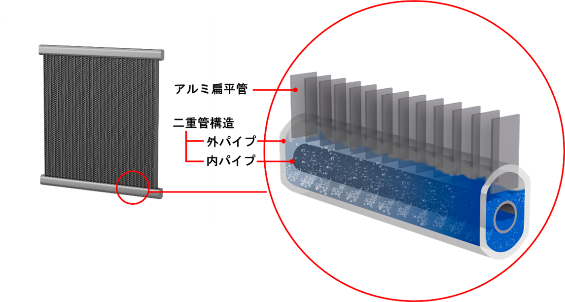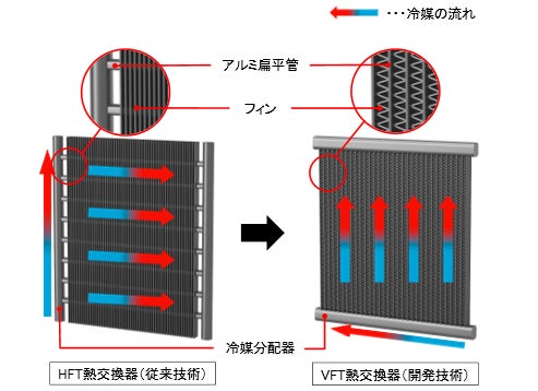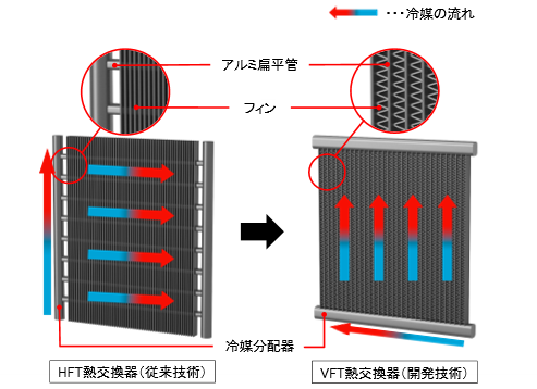 1.新構造の鉛直アルミ扁平管と高性能な冷媒分配器を開発、業界最高クラス※2の伝熱性能と熱交換器内部の冷媒量の削減を両立