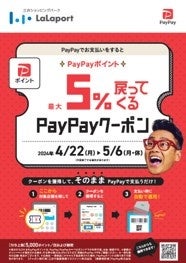 4月22日(月)~5月6日(月・休)の期間中に、対象施設の店舗にて「PayPay」支払いをご利用いただいた方に、ご利用日翌日~6月2日(日)まで使用できる10%クーポンを配布。配布されたクーポンを事前獲得のうえ、クーポン利用期間中に1会計2,000円(税込)以上お買物されると10%クーポンが適用されます。