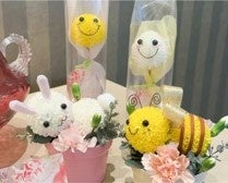 「ピンポンマム」という丸いお花にフェルトやワイヤーを貼り付けて『うさぎ』や『みつばち』をお作りいただけます。カーネーションで華やかに飾り付ける等、母の日のプレゼントにぴったりのアレンジメントです。