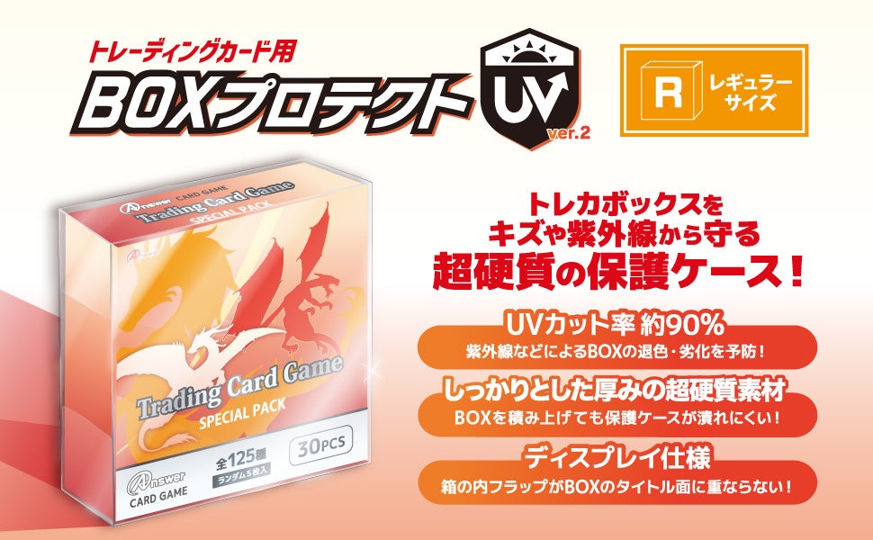 ゲーム周辺機器・トレカサプライメーカーのアンサー株式会社(本社:大阪府大阪市中央区、代表取締役社長:有村 勇志)は、大人気のトレーディングカードBOXを保護する超硬質ケース「トレーディングカード用 BOXプロテクトUV Ver.2(レギュラーサイズ)」を、公式アンサーストア、全国の家電量販店、小売店、専門店、インターネットショップ等にて順次販売を開始することをお知らせいたします。