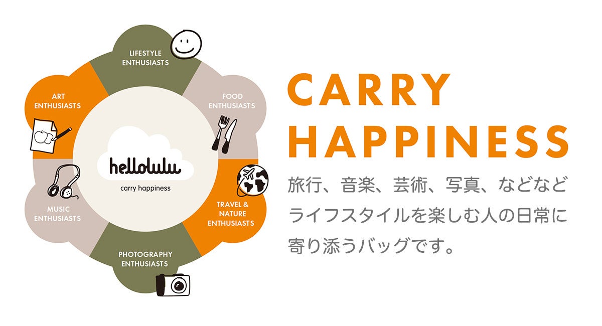 hellolulu(ハロルル)は、旅行・音楽・芸術・写真・など、様々な分野を楽しむ人の日常に寄り添うべく作られたバッグです。それぞれの好きな時間、好きなモノ、好きなコト、それぞれの"Happiness"を持ち運ぶためのバッグ「CARRY HAPPINESS」をコンセプトとしています。