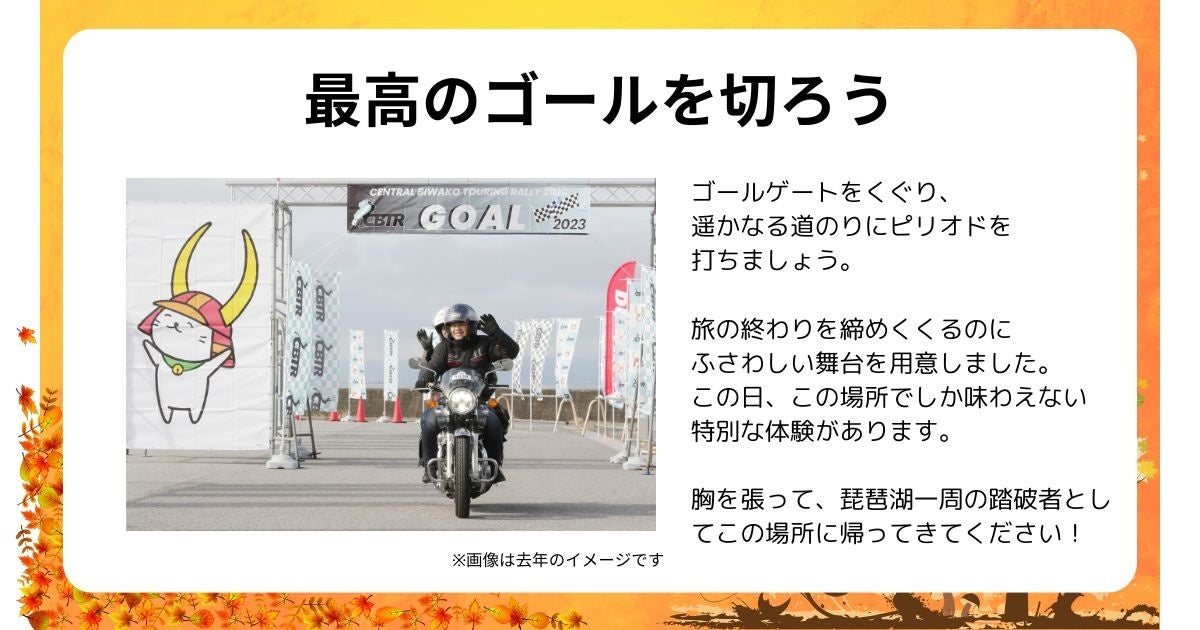 CBTRはデジタルスタンプを集めながらバイクで琵琶湖を1周、規定のスタンプを獲得した方には「琵琶湖1周踏破証明書」が発行される観光ツーリングラリーで、2022年9月に第1回を開催してから今年で3年連続の開催となります。