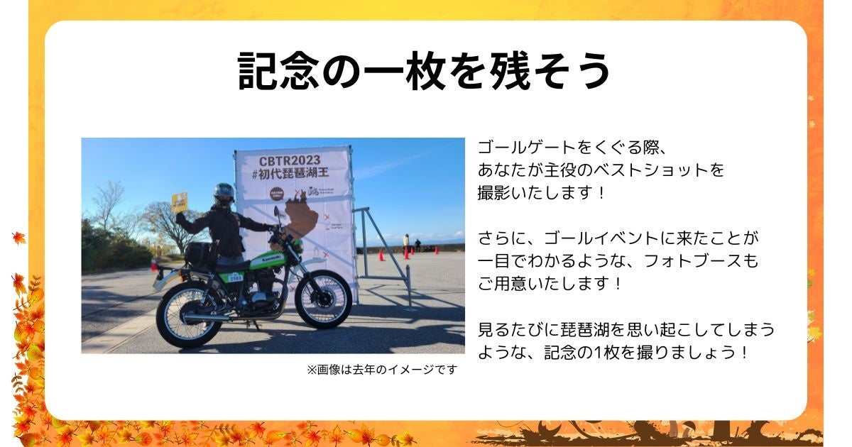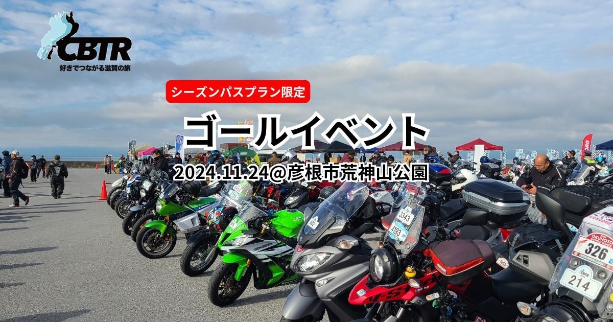 滋賀県の琵琶湖をバイクで1周しながらデジタルスタンプを集めるバイクツーリングイベントCBTR2024 (主催:CBTR2024実行委員会、運営:(株)ご当地ツーリング)が11/24(日)に彦根市荒神山公園にて開催予定のゴールイベントの事前予約を開始しました。(予約締切11/22(金)迄)