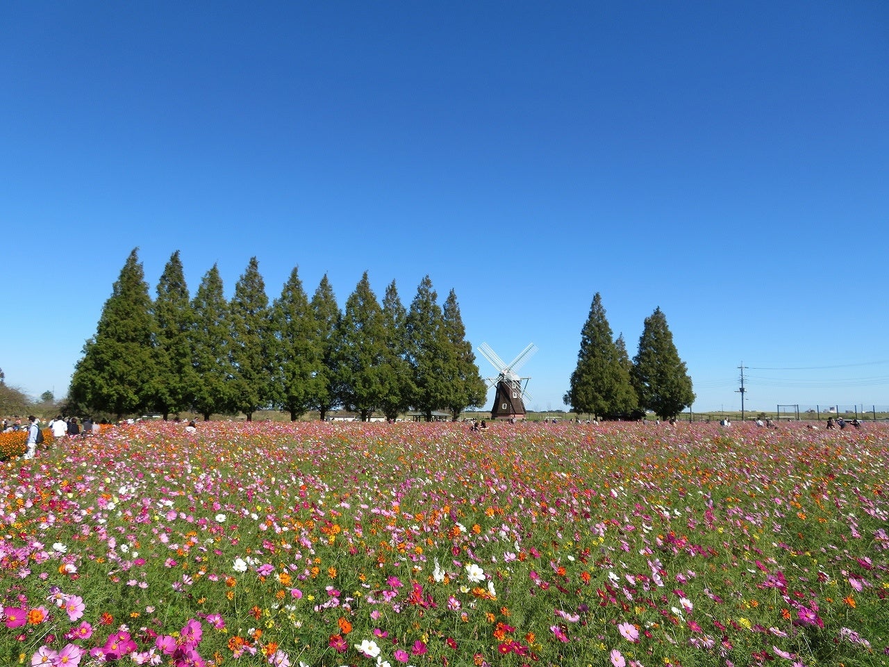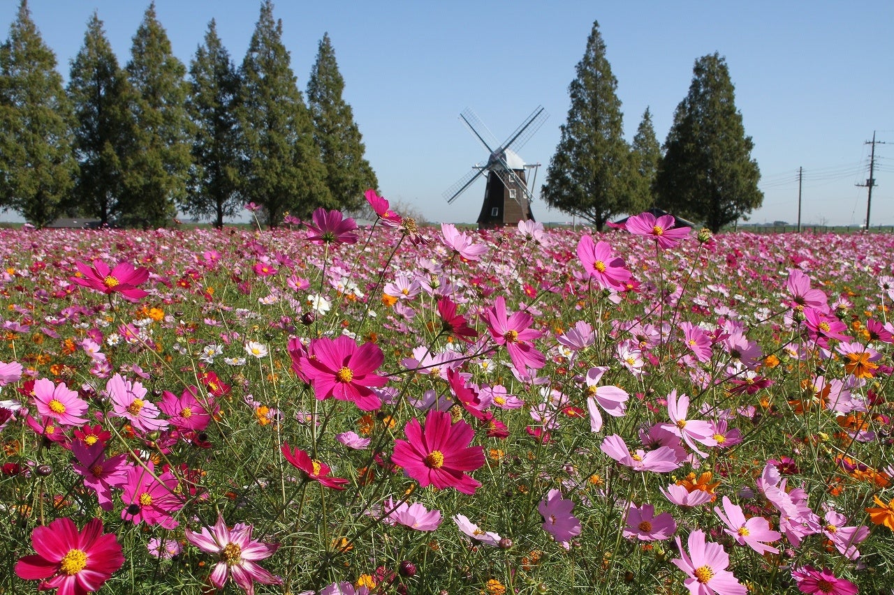 風車前花畑に広がる約2.2ヘクタールのコスモス。