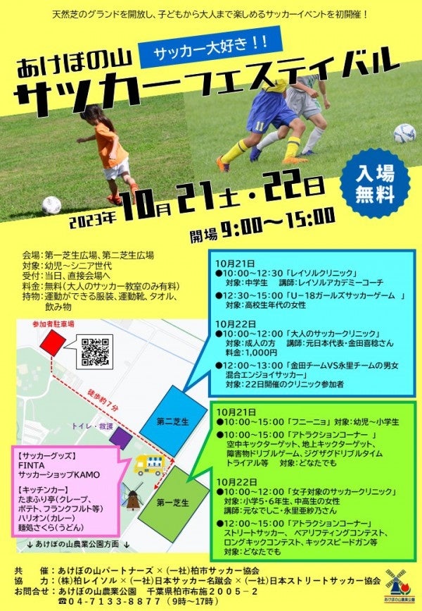 元日本代表選手を講師に迎えたサッカー教室や、どなたでも参加できるアトラクションコーナーなど、入場無料でご参加いただけます。サッカーで思い切り体を動かしましょう!!