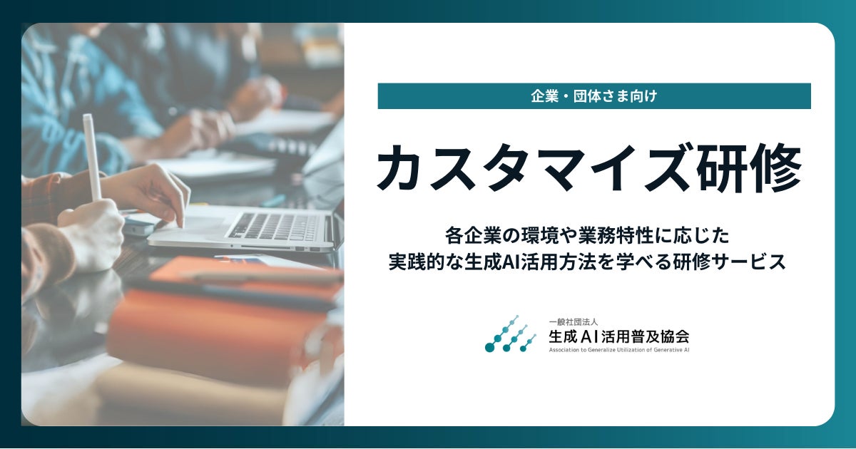 生成AIを社会に実装し、産業の再構築を目指す一般社団法人生成AI活用普及協会(理事長:井畑 敏、所在地:東京都千代田区、英称:Association to Generalize Utilization of Generative AI、以下:GUGA)は、実践的な生成AI活用方法(スキル)を学べる「カスタマイズ研修」の提供を開始しました。本サービスは、各企業の環境や業務特性のヒアリングを通じて、課題やニーズに応じた研修プランを提供することで、研修後、すぐに業務で生成AI活用を実践できる状態を目指すことが可能です。