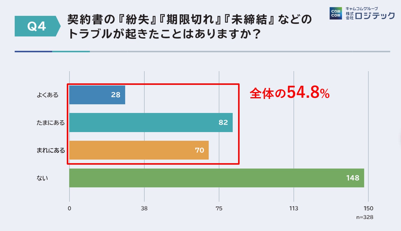 「働く」に関する社会課題をビジネスで解決するキャムコムグループの株式会社ロジテック(以下ロジテック、本社:東京都新宿区、代表取締役:縄田崇)は2025年8月から9月にかけ、物流関連事業者を対象に「物流業務における契約・取引管理の実態調査」を実施しました。その結果、契約管理の55%が紙やExcelによる運用に依存していることが明らかになりました。2024年に改正された物流関連二法(*1)により、契約条件の明確化や取引の適正化が求められる中、契約管理の属人化が業務トラブルや経営リスクにつながっている実態が浮き彫りとなっています。