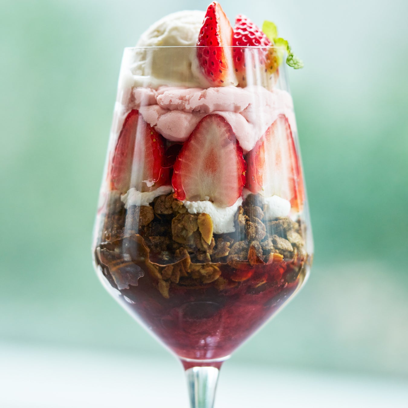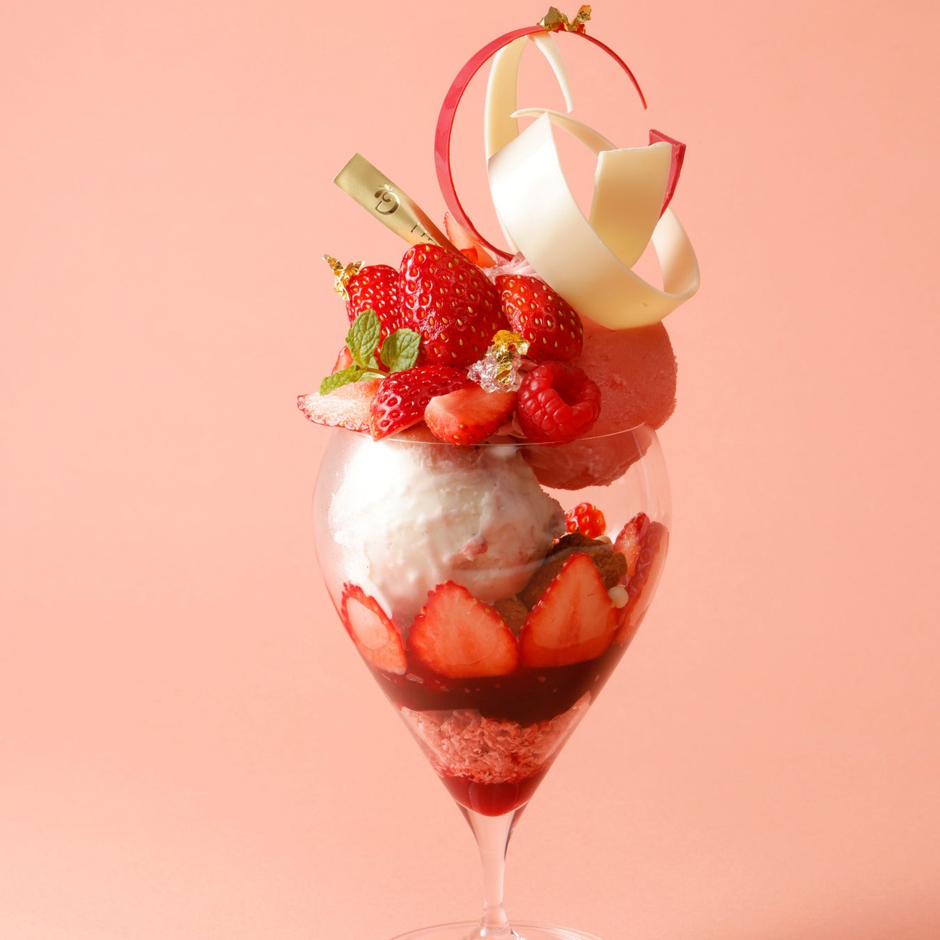 コクのあるマスカルポーネアイスと爽やかなイチゴのソルベにルビーチョコレートクリームを合わせた、甘みと酸味を堪能できる苺づくしのパフェ。