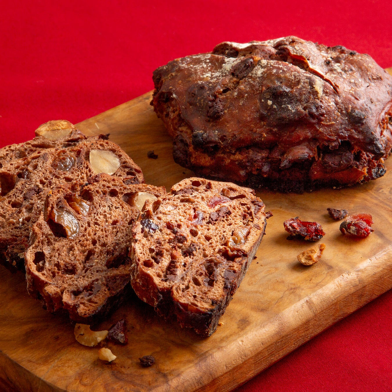 濃厚な乳味とキャラメル感のあるミルクチョコとフルーティーなビタースイーツチョコの2種のチョコレートにカカオニブを加えて焼き上げました。