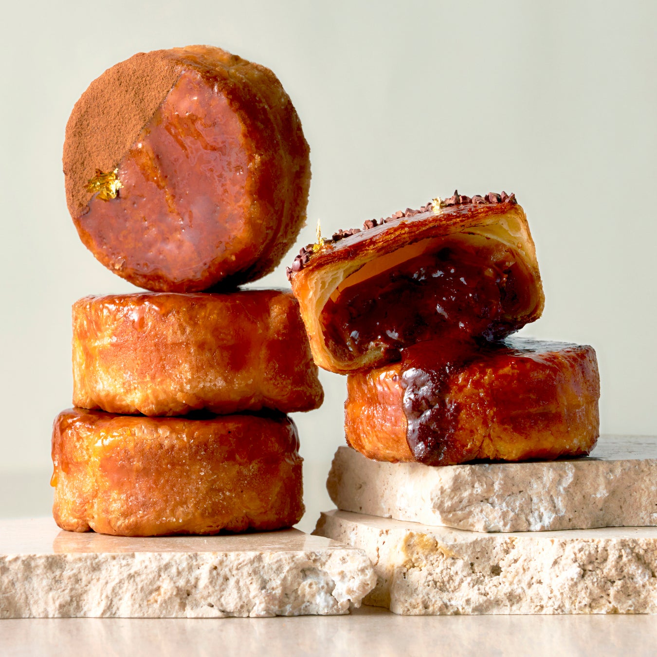 店頭で焼き上げる焼きたてのクイニーアマン。ご家庭で温め直すと、トロッと溢れ出すチョコレートをご堪能いただけます。