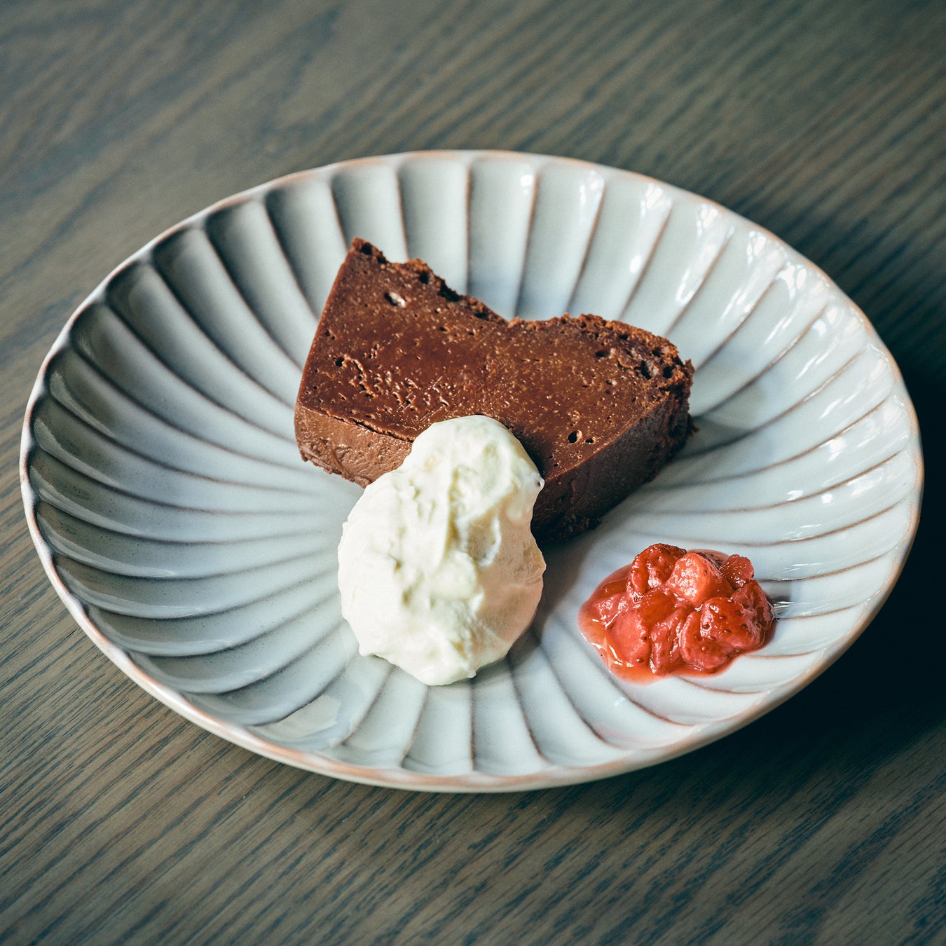 低温でじっくりと仕上げることにより、しっとりとした食感とビターチョコの濃厚な香りが楽しめる一品。お好みで甘酒のクリームやいちごのソースをつけてお楽しみください。