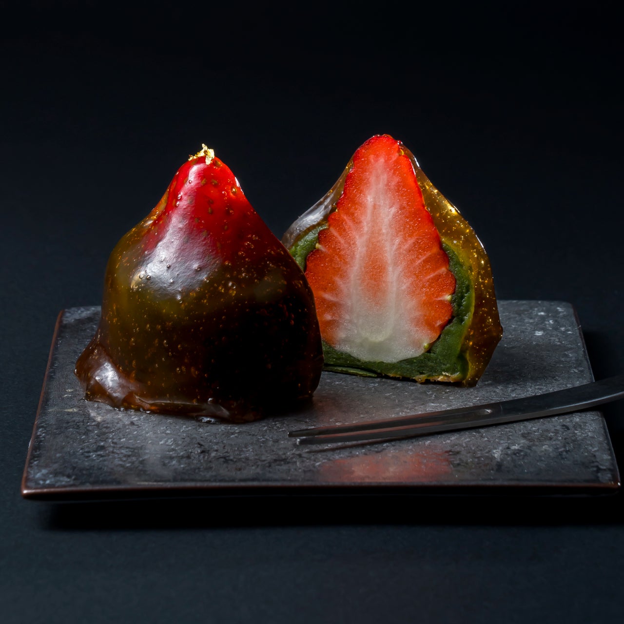 伊豆の摘みたて直送紅ほっぺを苺大福のように丸ごと使用。特製餡とぷるぷるのわらび餅で包み込んだ、一つ一つ職人の手仕込みで仕上げた逸品。
