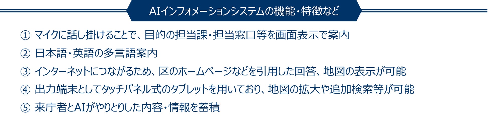 今回導入したAIインフォメーションシステムは、区民の皆さまの来庁目的やニーズ等を把握し、的確なインフォメーションサービスや品質向上、配置する総合案内従事者の業務負担軽減などを目的としています。