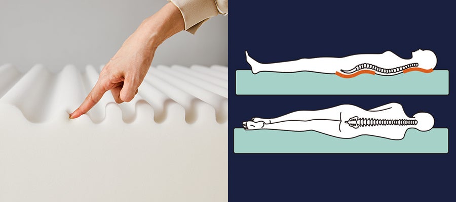 後頭部~肩、背中~お尻、二つのS字に沿って「理想的な寝姿勢」である、立っている時と同じ姿勢をサポート。仰向けでは全体重が均等に分散し、横向きでは肩や腰の凹凸が芯材のウェーブ部に優しく収まり、圧迫感を軽減します