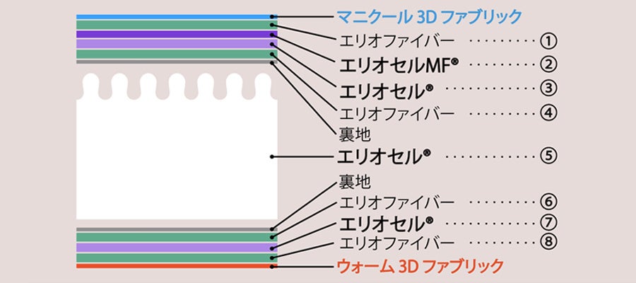 ウェーブ構造の芯材は「エリオセル」、側地には同じく「エリオセル」と、もっちりソフトな感触の「エリオセルMF(マインドフォーム)」と吸湿性に優れた「エリオファイバー」を使用。異なる特徴の三種の素材からなる、最上位モデルならではの8層構造が最高の寝心地を叶えます。