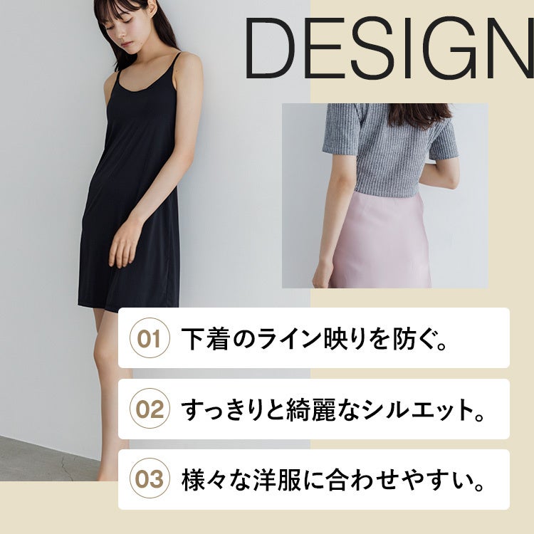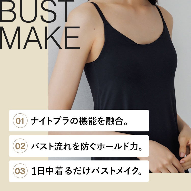 本製品は、ナイトブラとタンクトップの製造工程を融合させることで、今までにない一体型インナーを実現しました。ミリ単位での調整を繰り返し、バストラインを美しく保つ特殊加工が施されています。背中や脇部分のデザインにもこだわっているため、スリップとして着用いただく際には洋服に響きにくく、シンプルでありながらエレガントなシルエットを演出します。