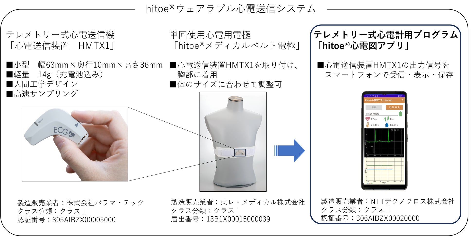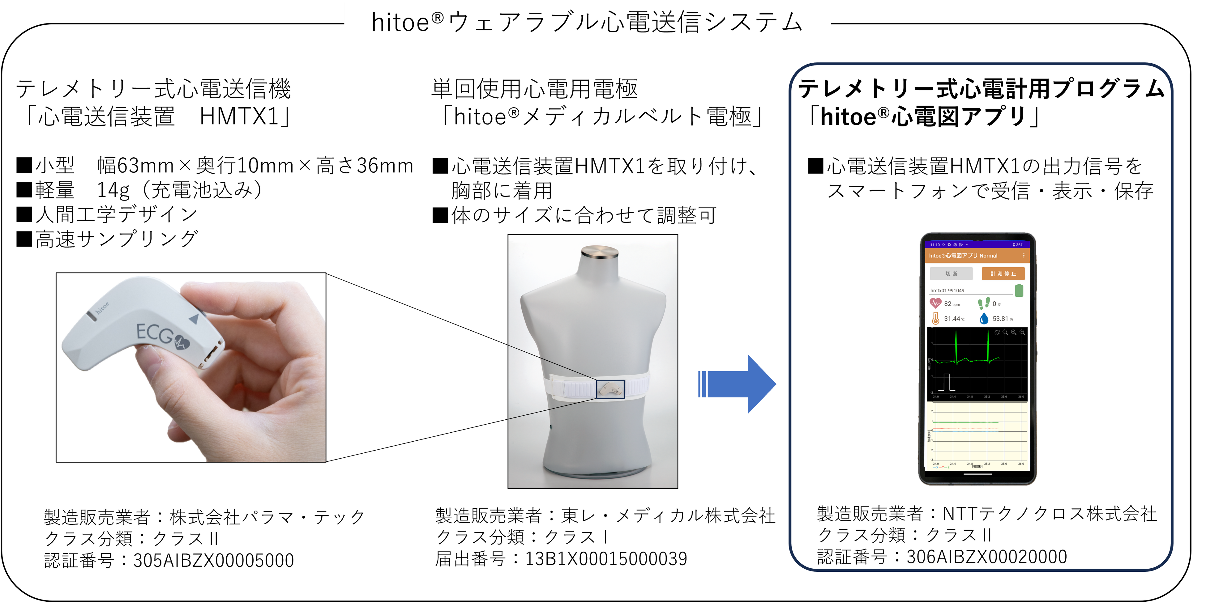 ソフトウェアの開発や製品化などを手掛けるNTTテクノクロスでは、2023年7月の「hitoe®ウェアラブル心電送信システム」の販売開始を皮切りに、同年9月には医療機器製造販売業許可を取得するとともに医療機器製造業登録を実施するなど、ヘルスケア・メディカル事業を推進しています。今回の「hitoe®心電図アプリ」の展開により、「hitoe®ウェアラブル心電送信システム」一式を医療用途として提供可能となりました。