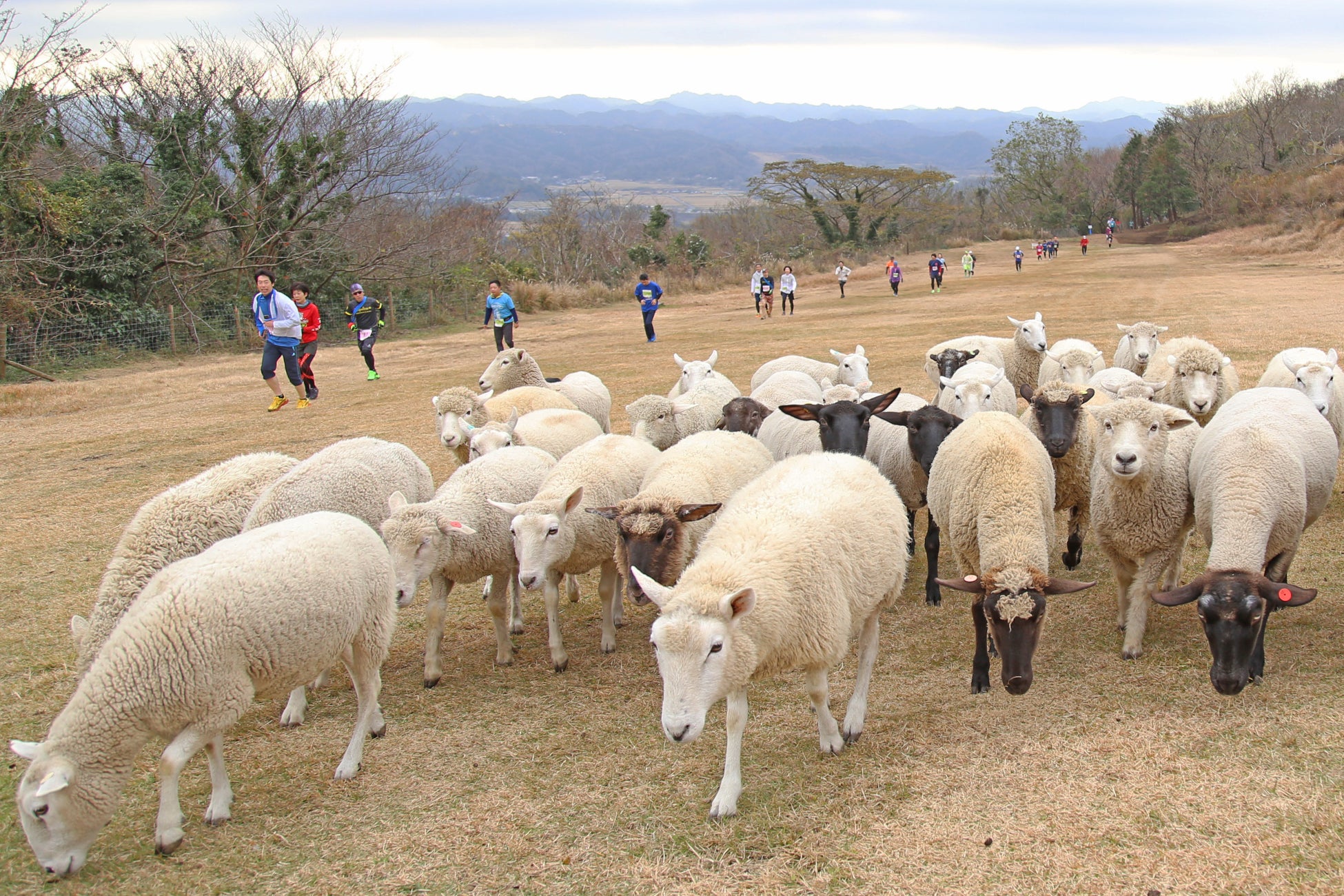 トレイルランのコースは、起伏にとんだ5kmのコースを×4周する合計20km!5kmのコースには、放牧された羊の群れの中を走るマザー牧場ならではの特徴的なエリアや、標高300mの立地を生かした見晴らしの良い眺望のエリア、水仙のあまい香りを楽しみながら走れるエリアなど、たくさんのエリアがあり走っていて飽きのこないコースです。
