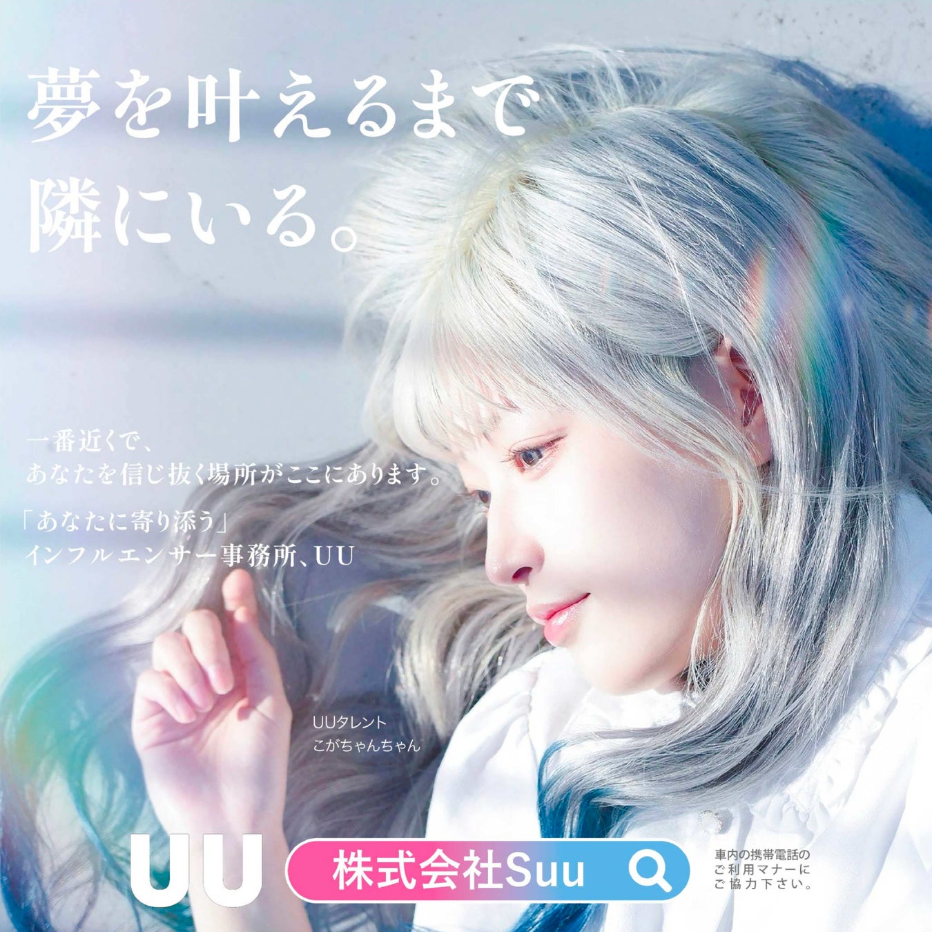 株式会社Suu(本社:東京都渋谷区、代表取締役:安藤鈴菜、以下「UU」)は、所属インフルエンサー「こがちゃんちゃん」を起用した事務所広告を、西武鉄道の車内連結ステッカーにて掲出開始したことをお知らせいたします。本広告は、次世代のクリエイティブシーンを牽引するUUの所属クリエイターを広く知っていただくための、事務所ブランディング施策の第一弾となります。