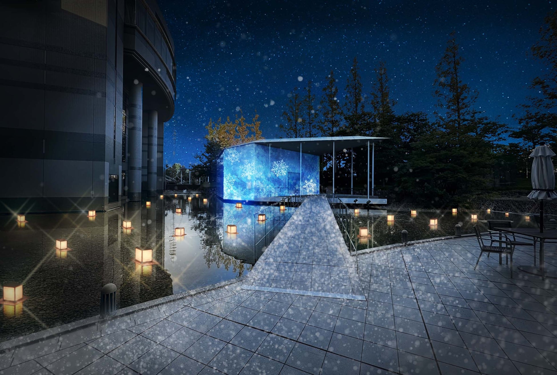 雪がめったに降らない大阪。気象庁のデータではここ10年、積もるほどの雪は観測されていません。本イベントでは、そんな大阪にあったひとときのホワイトクリスマスをお楽しみいただけます。会場となるのは「永遠」と名付けられた白いデザイナーズチャペル「エタニティ-eternity-」が浮かぶウォーターガーデンです。本会場に雪の演出に合わせてプロジェクションマッピングで雪の結晶などの映像を投影し、幻想的な光の世界をお届けします。
