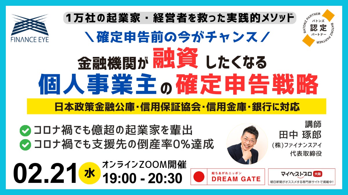 株式会社ファイナンスアイ(本店:大阪府大阪市、代表取締役:田中 琢郎。以下、ファイナンスアイ)は起業家・経営者・個人事業主向けに【スモールM&Aもゼロイチの起業も創業融資を活用。デットファイナンスの成功事例から学ぶ。日本政策金融公庫・信用保証協会付け融資の戦略的活用法】を開催します。1万社の起業家や経営者を支援し、コロナ禍でも支援先の倒産率は0%を達成し、コロナ禍でも億超えの起業家を創出し続けたファイナンスアイが伝えます。開催日時は天皇誕生日の2024年2月23日(金)16:00にウェビナー形式で開催します。皆さまもご存じの通り、金融機関は困ってからでは融資をしてくれません。成功する経営者と失敗する経営者の分かれ道はどこだったのか?失敗する経営者は、会社員(個人)の世界観から抜け出せず『融資=悪いもの・怖いもの』という間違った思考に縛られていました。成功する経営者は、経営者の融資は将来のリターンへの投資であると認識していました。成功者たちが最初の創業融資を受ける時、事業を成長させる時、苦しい時どのような状況でどのような思考プロセスで何を意思決定し成功への階段を駆け上がっていったのでしょうか。1万人の起業家や経営者を支援してきたリアルな現場で見た現実の話を皆さんにお伝えします。成功する経営者も失敗する経営者も、最初は普通の真面目な会社員でした。一握りの天才的な英雄でなければ成功できないわけではありません。ファイナンスアイが一緒に伴走してきた現実の話をお伝えします。セミナーを受けた後、アナタのビジネスはファイナンスの力を得て、成功へと躍進することでしょう。