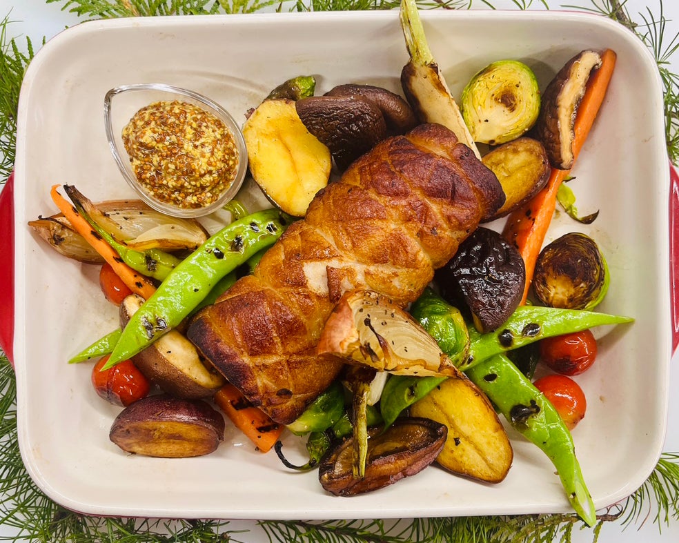 ジューシーな美瑛豚のバラ肉に、フレンチマスタードとハーブを巻き込み、香ばしく焼き上げました。美瑛・萌育実生産組合濱田さんの肉厚な椎茸をはじめ、北海道の冬野菜をたっぷりと添えてお渡しします。