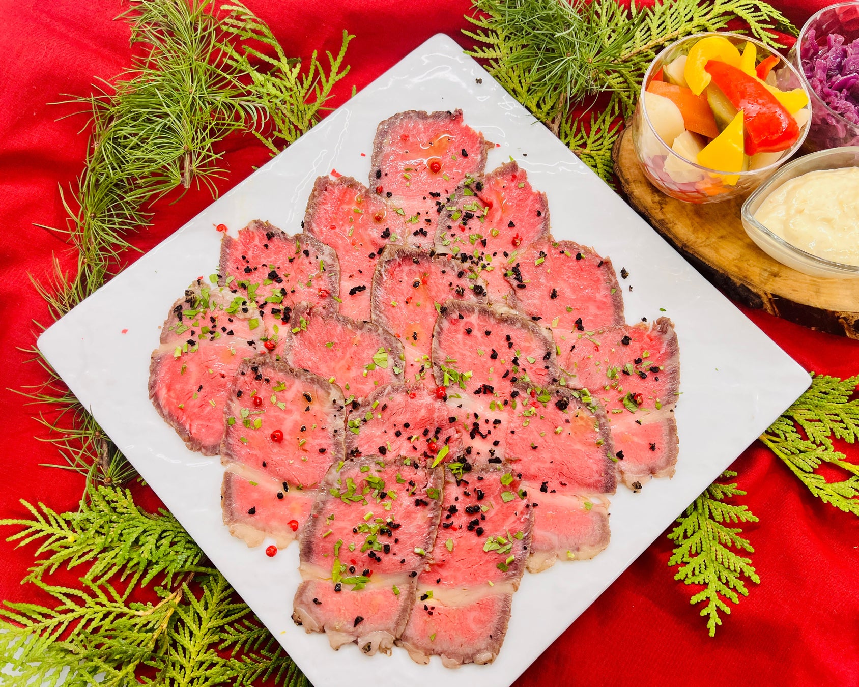 じっくり火を通したふらの和牛のローストビーフを芳醇な山わさびソースとともにどうぞ。お口直しに、さっぱりとしたピクルスと赤キャベツマリネを召し上がってください。