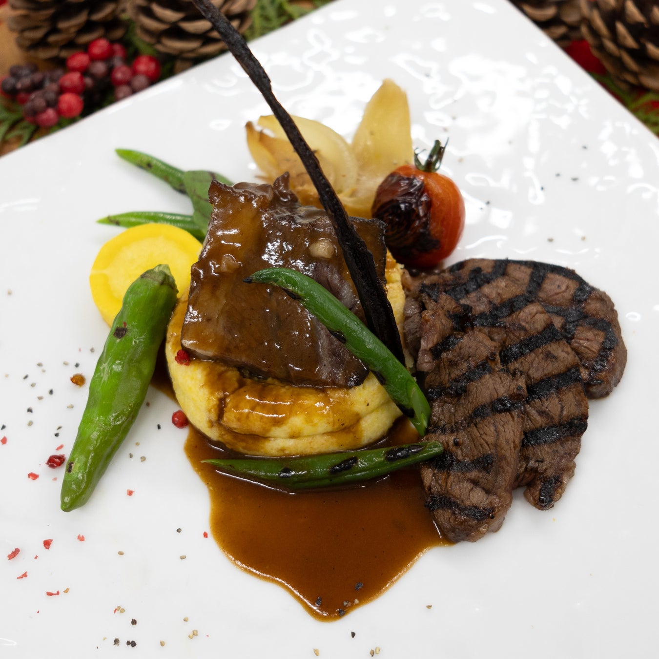 北海道ビーフ頬肉の赤ワイン煮込みバニラソースとふらの和牛もも肉のステーキ