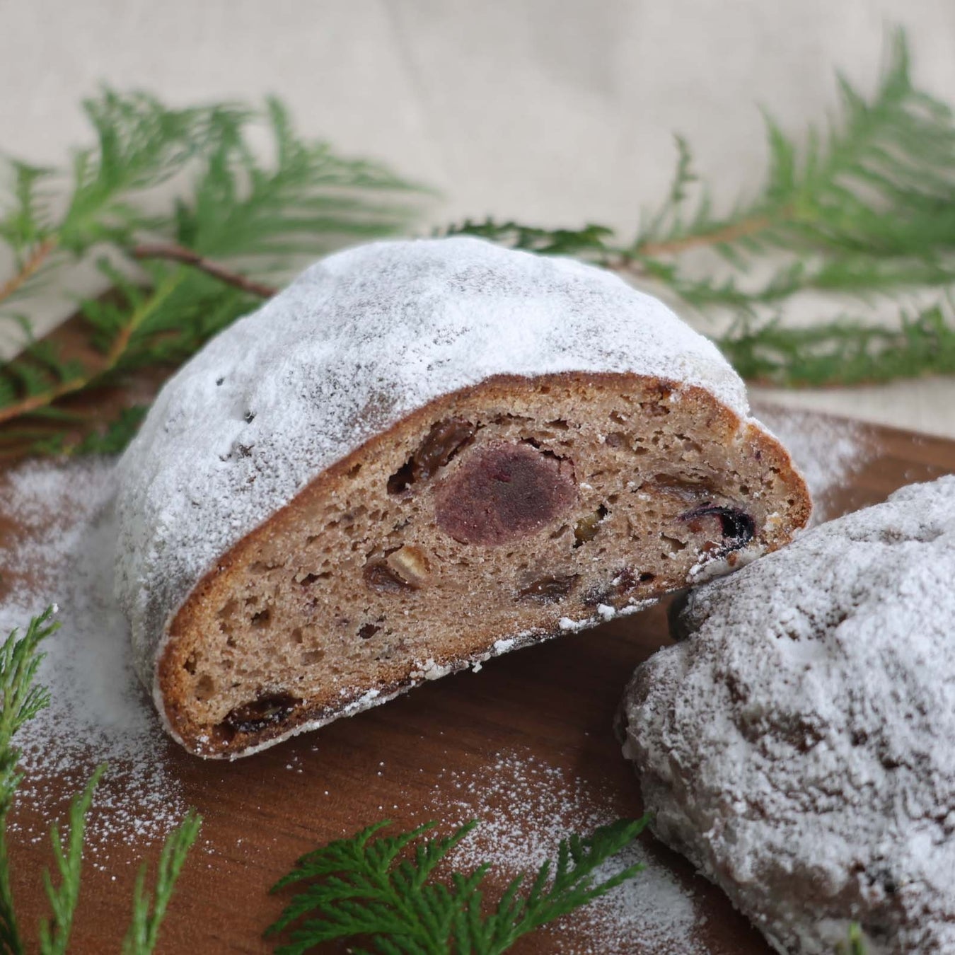 ドイツでは地域によって様々なシュトレンがあると言われていますが、今回はドイツ中部に位置するテューリンゲン地方のレシピでおつくりしました。マジパンは使わずに、2種類のリキュールを漬け込みコクを出したオーガニックレーズン、ドライクランベリー、オレンジ、アーモンドを贅沢に混ぜ込んでいます。小麦は、北海道美瑛小麦を使ったオリジナル小麦粉「美瑛の風」を使用して、生地のおいしさもしっかりと引き出しました。