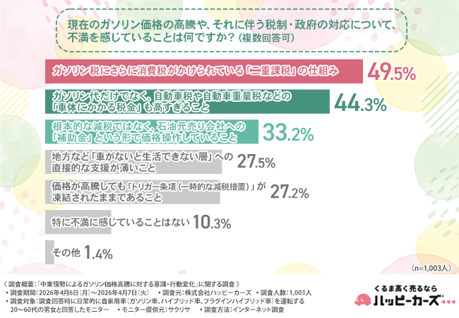 次に、「現在のガソリン価格の高騰や、それに伴う税制・政府の対応について、不満を感じていること」について尋ねたところ、『ガソリン税にさらに消費税がかけられている「二重課税」の仕組み(49.5%)』と回答した方が最も多く、『ガソリン代だけでなく、自動車税や自動車重量税などの「車体にかかる税金」も高すぎること(44.3%)』『根本的な減税ではなく、石油元売り会社への「補助金」という形で価格操作していること(33.2%)』と続きました。