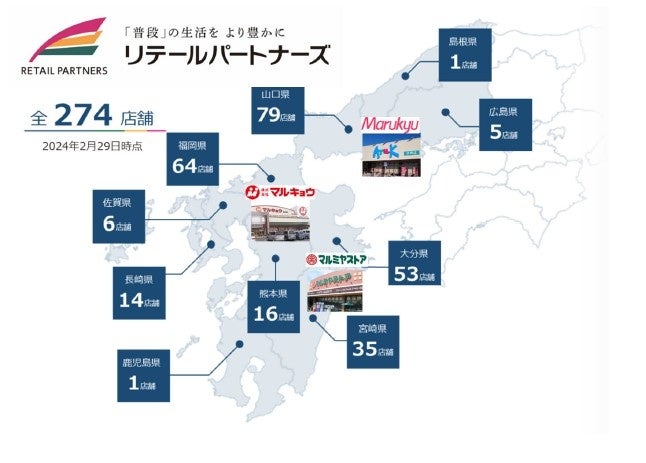 リテールパートナーズは、山口県を拠点に中国地方西部を主な地盤とする丸久(本社:山口県防府市)と、大分県を拠点に九州地方東部(沖縄県を除く)を地盤とするマルミヤストア(本社:大分県佐伯市)及び福岡県を拠点に九州北西部を地盤とするマルキョウ(本社:福岡県大野城市)3社を傘下に持ち、食品スーパーマーケット事業、ディスカウントストア事業274 店舗を展開し、西日本における有力なスーパーマーケットの連合体を目