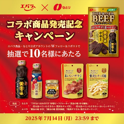 株式会社なとり(本社:東京都北区 会長兼社長:名取三郎)は、エバラ食品工業株式会社(本社:神奈川県横浜市、代表取締役社長:森村剛士)とのコラボレーション商品として「THEおつまみBEEF 厚切ビーフジャーキー 黄金の味 中辛風味」を6月9日(月)より期間限定で新たに発売いたします。