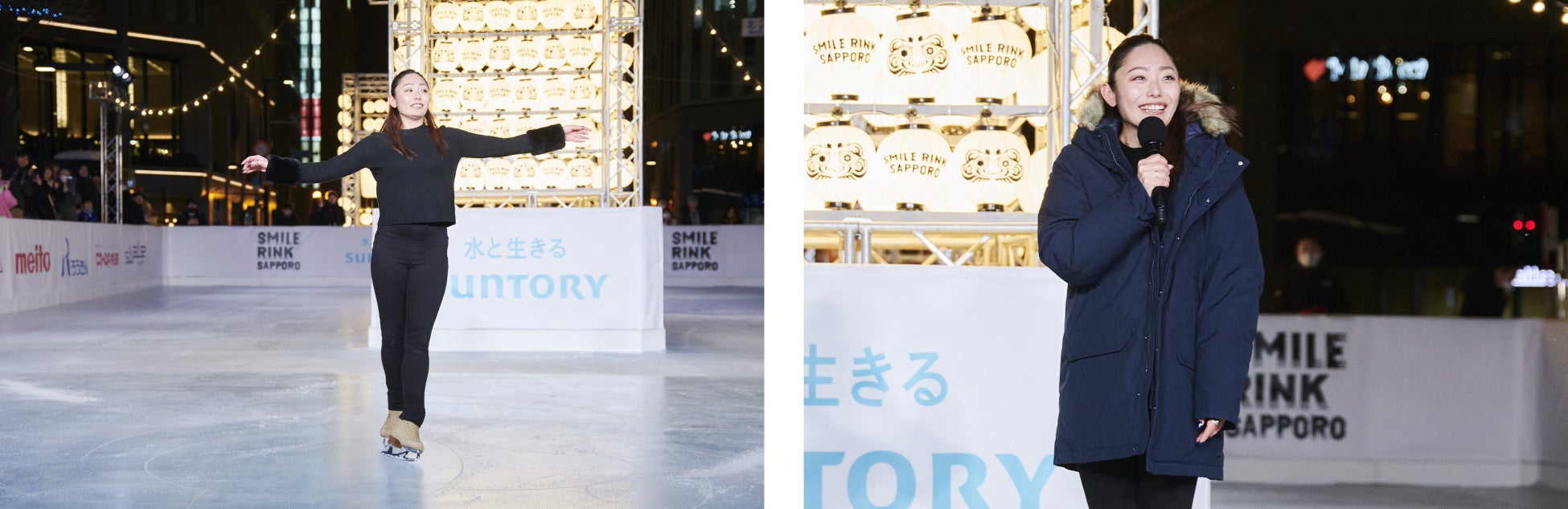 セレモニーにはプロフィギュアスケーターの安藤美姫さんがスペシャルゲストとして登場し、スケーティングやミニトークを披露。秋元克広札幌市長、濱坂真一北海道副知事らと共に、皆様の笑顔と安全を祈念してだるまに目入れを行いました。