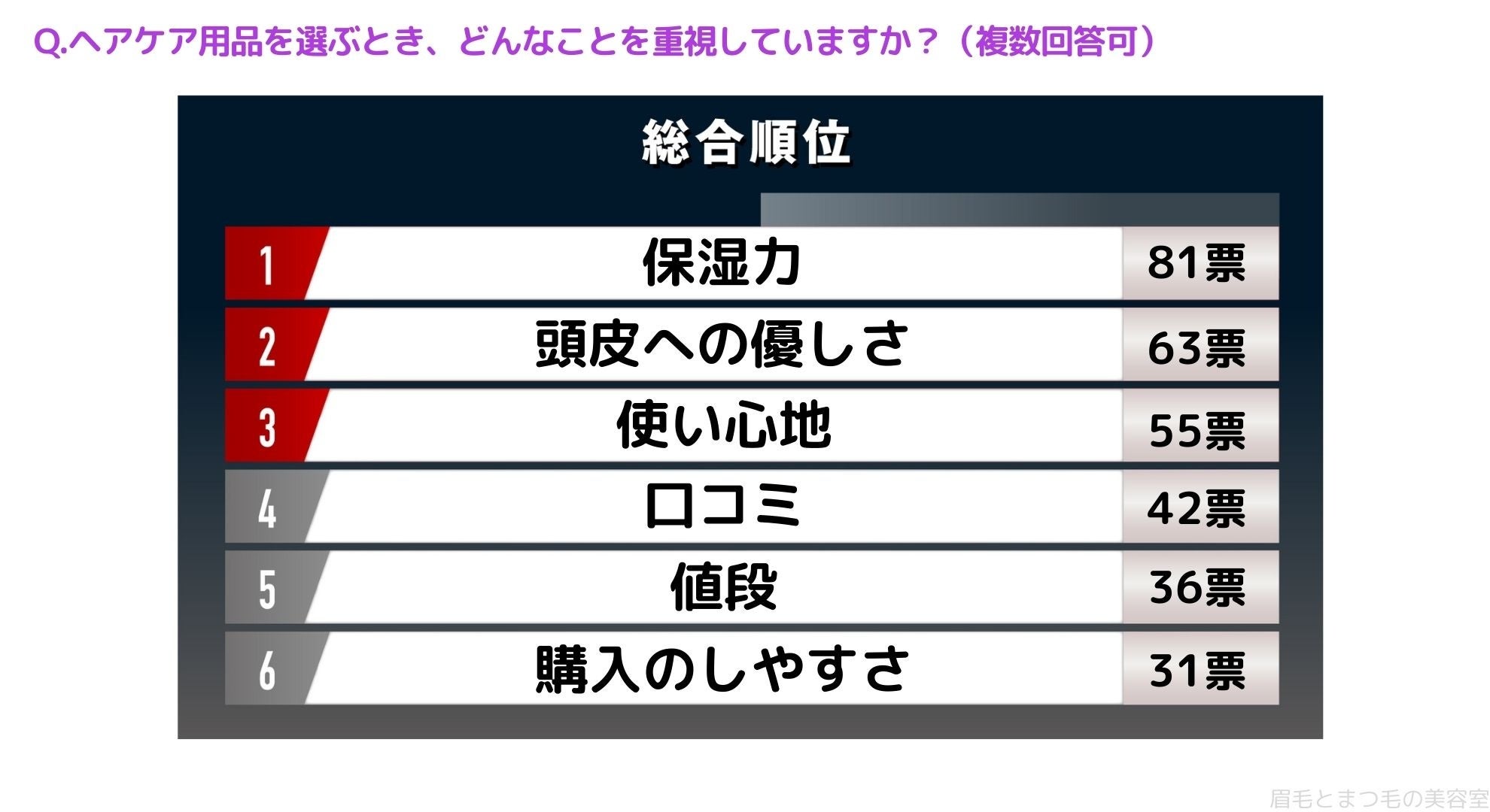 ヘアケア用品で重視していることをお聞きしたところ「1位>保湿力(81票)」、「2位>頭皮への優しさ(63票)」、「3位>使い心地(55票)」、「4位>口コミ(42票)」、「5位>値段(36票)」、「6位>購入のしやすさ(31票)」という結果になりました。
