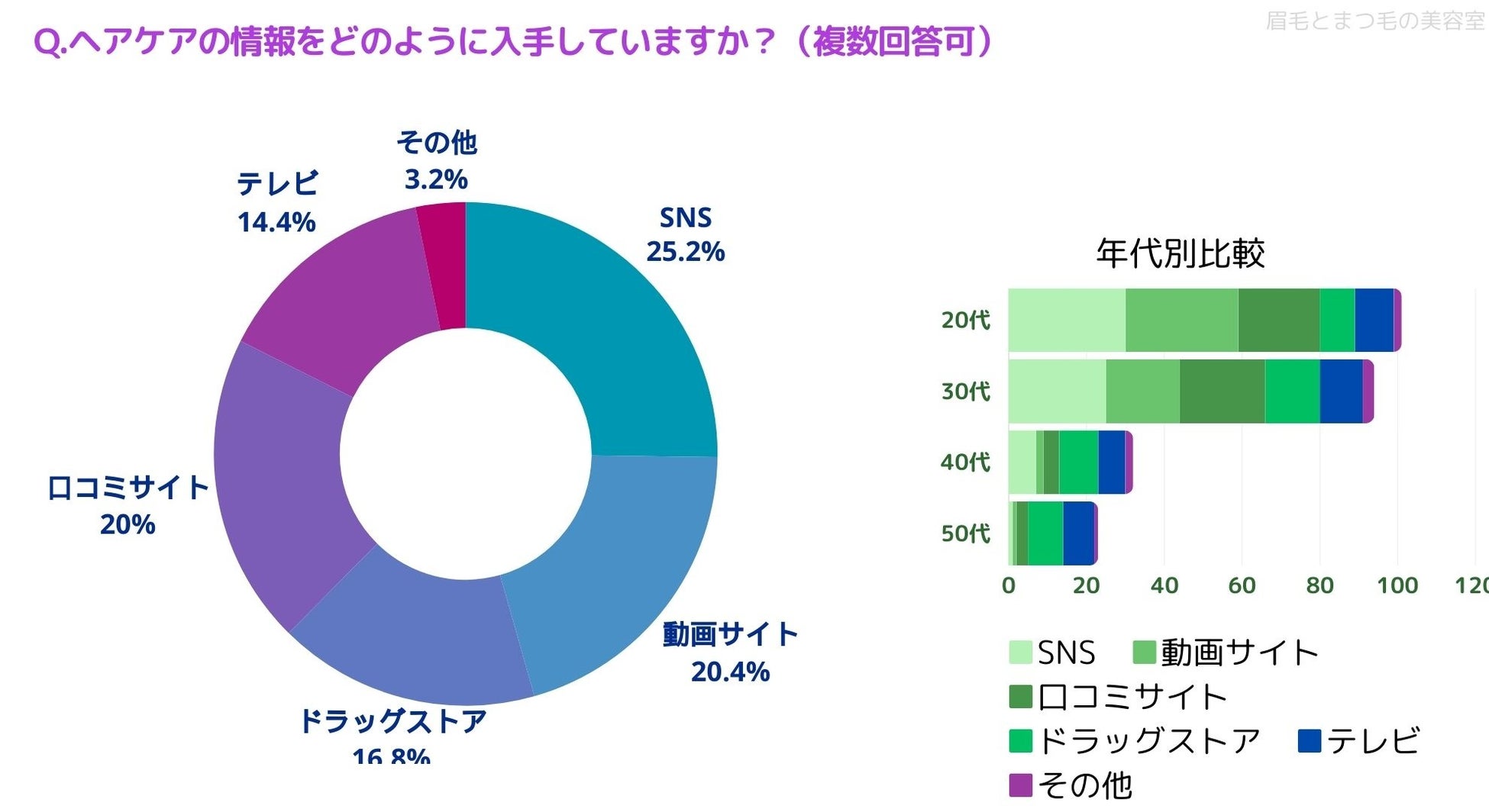 ヘアケア情報をどのように入手しているかお尋ねしたところ「SNS(25.2%)」、「動画サイト(20.4%)」、「ドラッグストア(16.8%)」、「口コミサイト(20%)」、「テレビ(14.4%)、「その他(3.2%)」という結果になりました。