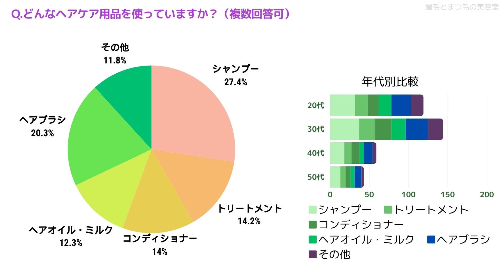 どんなヘアケア用品を使っているかお尋ねしたところ「シャンプー(27.4%)」、「トリートメント(14.2%)」、「コンディショナー(14%)」、「ヘアオイル・ミルク(12.8%)」、「ヘアブラシ(20.3%)」、「その他(11.8%)」という結果になりました。