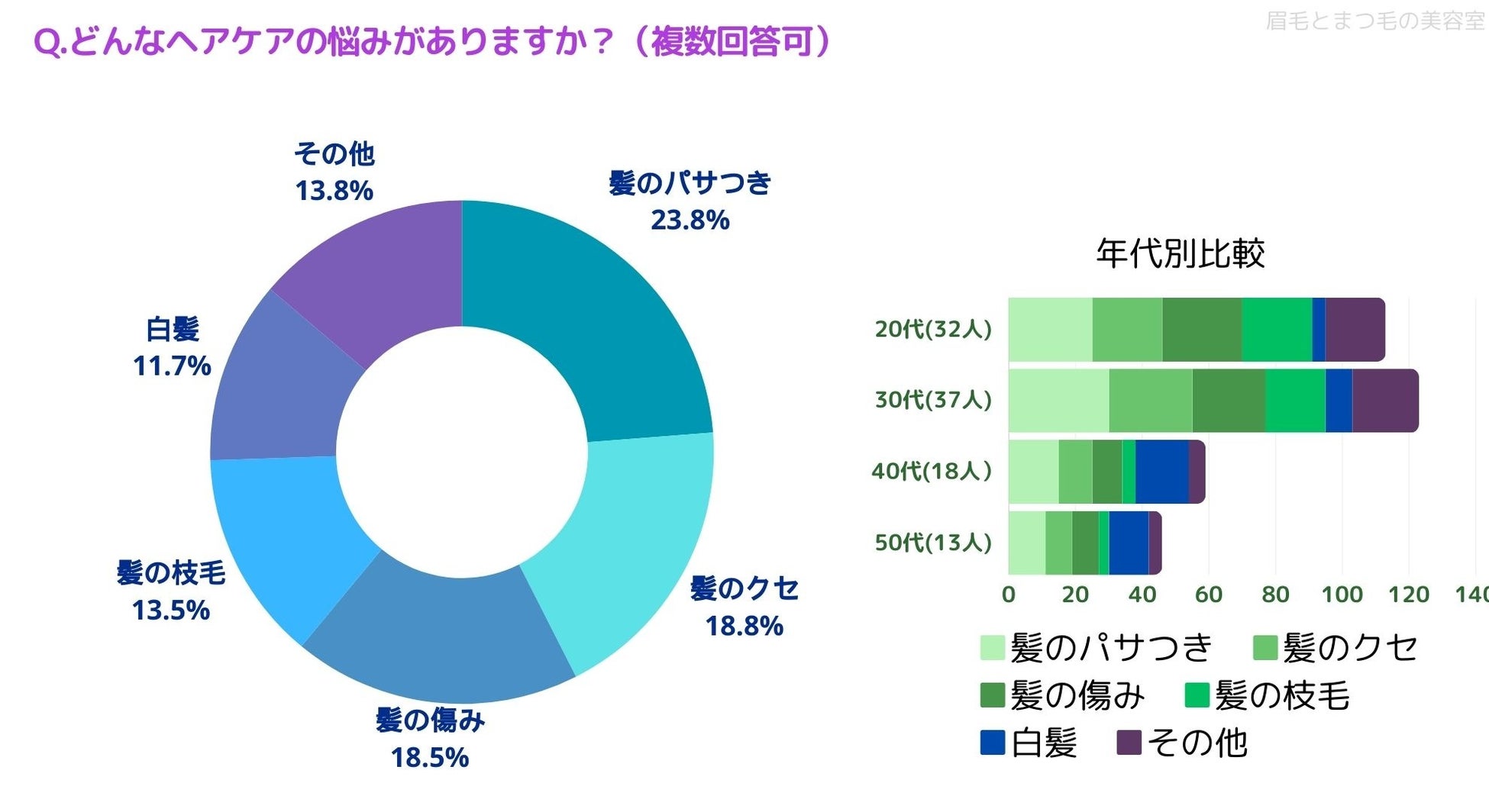 「髪のパサつき(11票)」、「髪のクセ(8票)」、「髪の傷み(8票)」、「髪の枝毛(3票)」、「白髪(12票)、「その他(4票)」