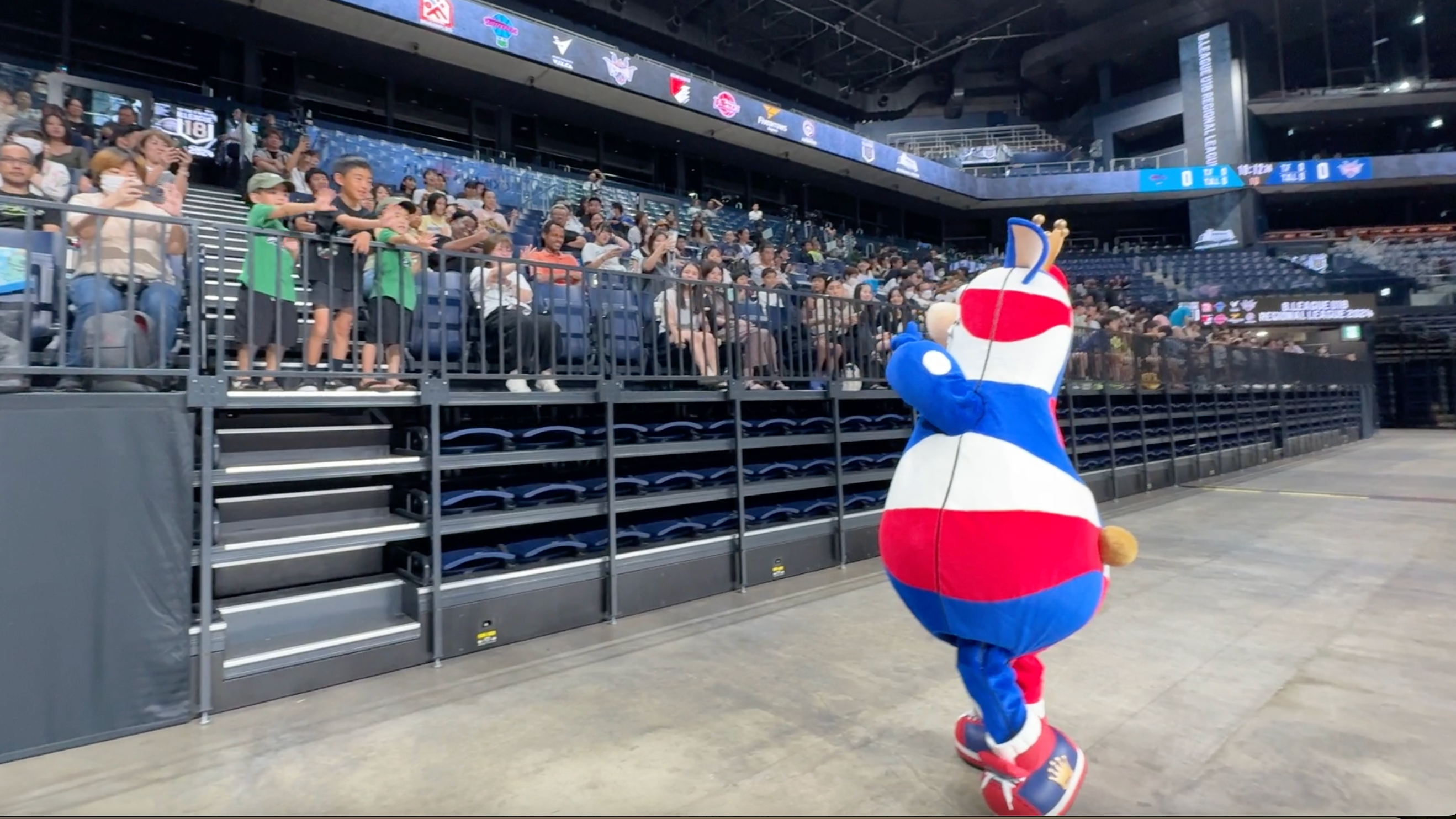 沖縄アリーナ開催2日目となる7月21日(日)には、琉球ゴールデンキングスのマスコット「ゴーディー」が琉球ゴールデンキングスU18の激励に駆けつけ、試合前にお客さまと交流しながら盛り上げました。