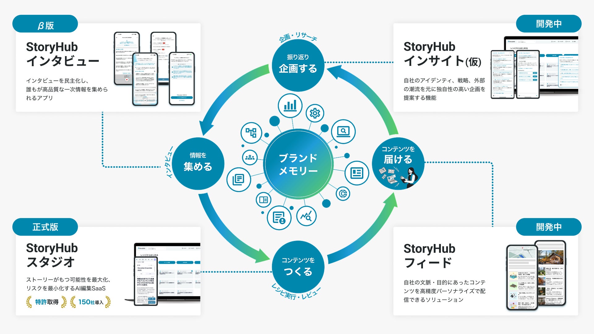 これらのノウハウとネットワークを企業のストーリーテリングに展開するために設計した、AIネイティブなマルチプロダクト基盤が「StoryHubプラットフォーム」です。