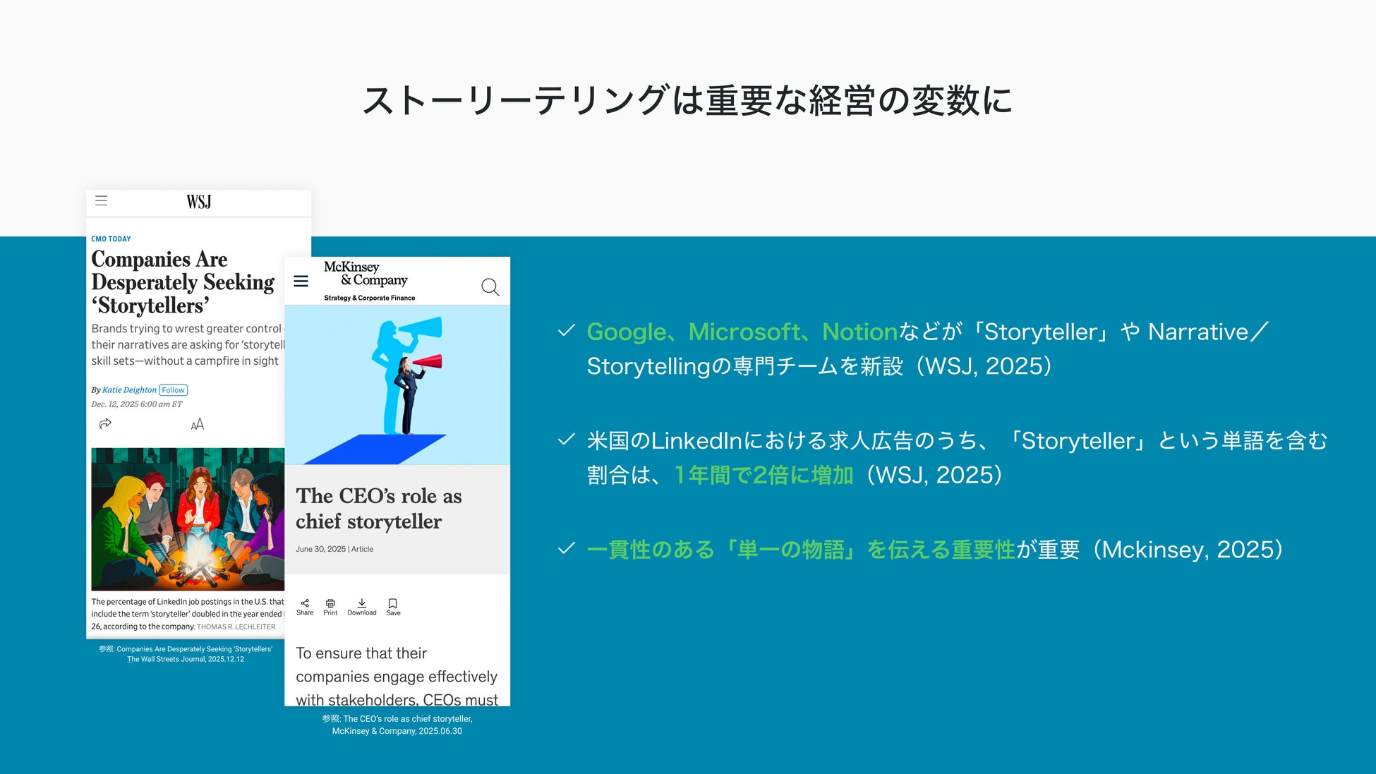 こうした流れは経営層にとどまらず、PR、IR、マーケティング、ブランディング、採用広報など、各ステークホルダーと向き合う現場部門にも広がっています。ウォール・ストリート・ジャーナル(*1)は、企業が顧客・投資家・採用候補者に自社の物語をより直接的に届けるため、「ストーリーテラー」の肩書きを持つ専門人材の採用を拡大していると2025年に報じました。Google、Microsoft、Notionなどが専門チームを新設し、LinkedIn上では”storyteller”を含む求人掲載は前年の2倍に達しています。