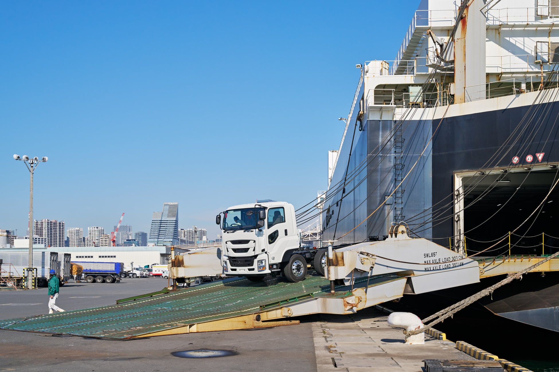いすゞロジ様は、いすゞ自動車 藤沢工場で生産される大型・中型・小型の各車輛を品川港等まで搬送したのち、栗林商船グループのRORO船等を利用し国内の車両物流を実現しています。