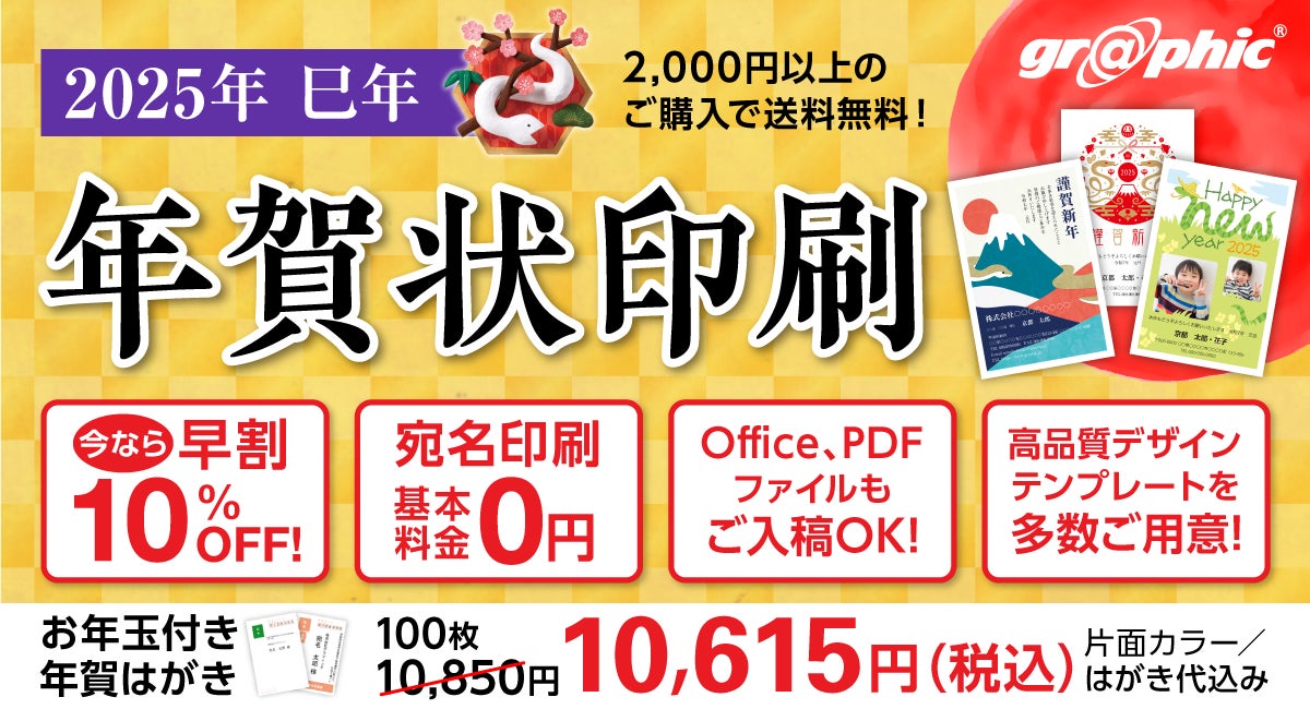 株式会社グラフィック(本社:京都市伏見区、代表取締役社長:西野能央、以下「当社」)はネット印刷事業にて、年賀状を10%OFFでお得に印刷できる「早割キャンペーン」を開始いたしました。400点以上の無料デザインテンプレートもご用意しております。