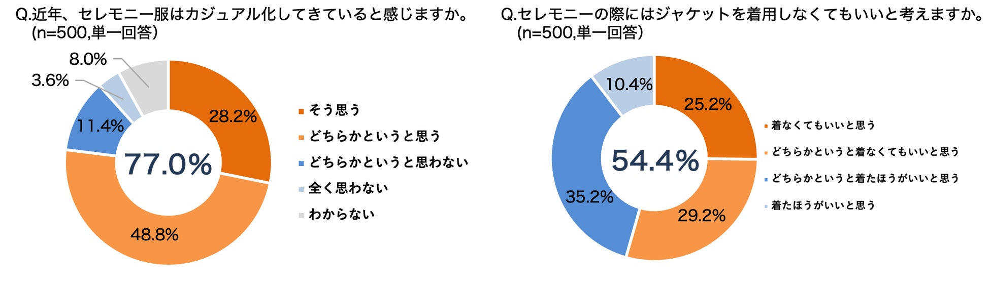 春に訪れる卒入園・卒入学式で着用する「セレモニー服」について、約8割(77.0%)がカジュアル化してきていると感じていると回答。さらに、セレモニー服の定番でもあるジャケットを着用しなくてもいいと思う人が全体の半数を超える(54.4%)結果となりました。コロナ禍以降、式典の形式や生活スタイルなども変化している流れを受けて、セレモニー服もカジュアル化してきていることがうかがえます。