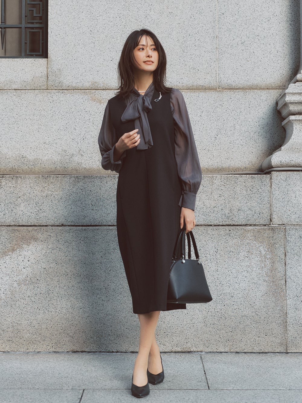 スタイリッシュにセレモニースタイルを着こなしたい方には「ダブルクロスジャンパードレス」がおすすめ。首元をシャープに見せる深めのVネックとIラインのシルエットが織り成すすっきりとしたデザインは、重ねるアイテムを選ばずに着られます。シアーなインナーを合わせると、今どきなセレモニースタイルに仕上がります。Tシャツやカットソーにスニーカーを合わせてカジュアルにも着られる、汎用性の高さが魅力のアイテムです。