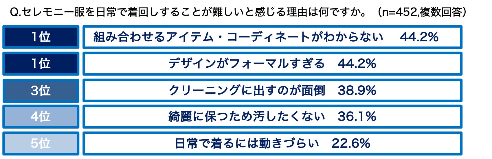 7割以上(74.4%)のママが、セレモニー服を日常でも着回したいと回答した一方で、約9割(90.4%)のママがセレモニー服を日常で着回しすることが難しいと感じていることが明らかになりました。その理由の第1位が「組み合わせるアイテム・コーディネートがわからない(44.2%)」「デザインがフォーマルすぎる(44.2%)」となり、次いで「クリーニングに出すのが面倒(38.9%)」という結果に。合わせるアイテムやどのようなコーディネートがよいかなど、着回しする上での課題が浮き彫りとなりました。