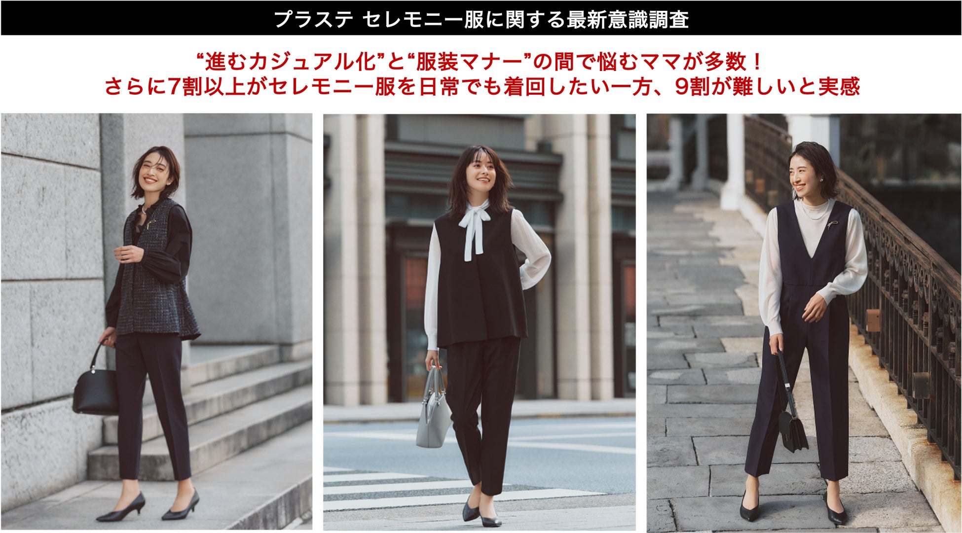 ファーストリテイリンググループの、きちんとしていたい時の“毎日服”を提案するブランド「PLST(プラステ)」は、20〜59歳までの保育園・幼稚園~高校生のお子様がいる全国のママ500名を対象に、卒入園・卒入学式で着用する「セレモニー服」に関する意識調査を実施しました。調査から、セレモニー服がカジュアル化している実態や、その中でマナーとのバランスや日常での着回しに関する悩みが多数あることがわかりました。