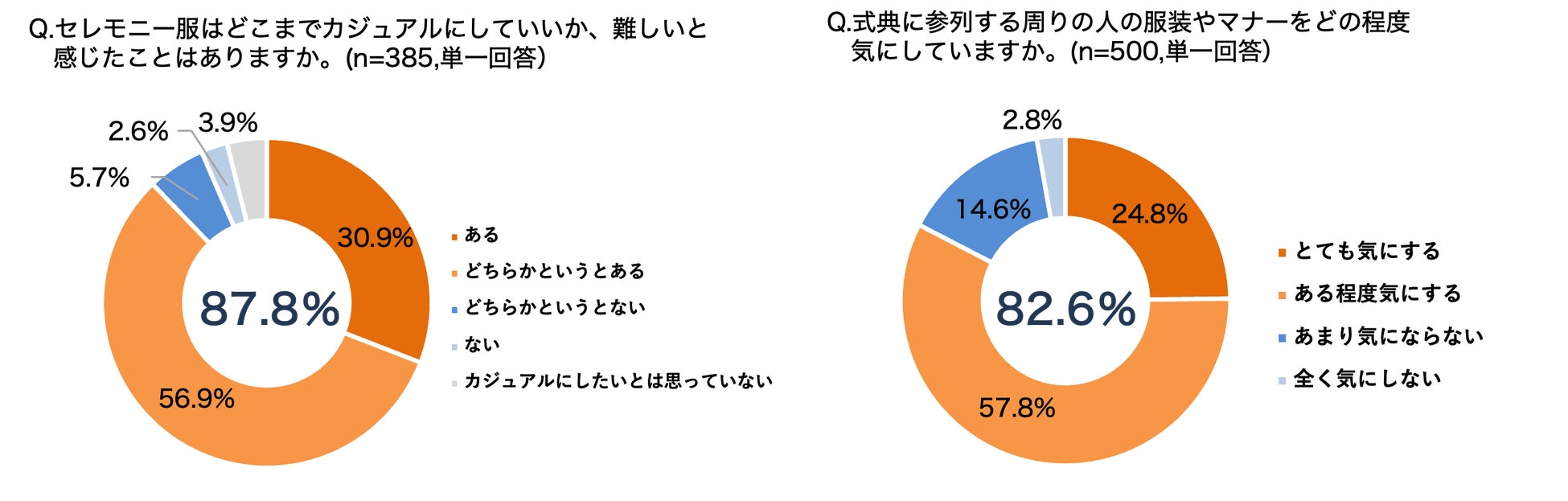 カジュアル化が進んでいるという声が多かった一方、どこまでカジュアルにしていいか難しいと感じている人は約9割(87.8%)にものぼることが明らかに。また、式典に参列する周りの人の服装やマナーをどの程度気にしているかという質問に対して、気にすると答えたママは8割以上(82.6%)となり、多くの人がカジュアル化の線引きに頭を悩ませていることが浮き彫りとなりました。記念すべきセレモニーの機会にマナー違反になりたくない、失敗したくないという意識があることもうかがえます。